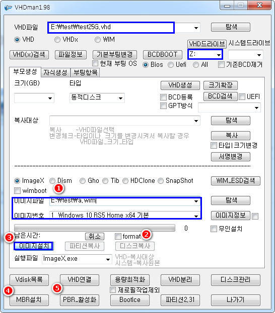 4,5 mbr설치, pbr설치_활성화 필요하면 vhd드라이브를 선택하고 4,5번 버튼을 눌러주면 됩니다.